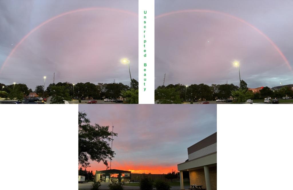 ’twas a pleasant and very unexpected surprise π as there were barely a few raindrops on the car windshield during my drive and when I parked. I set about trying to capture the glory of the moment. Couple of pictures of the rainbow and then I ran around to take picture of the other side of the sky. I was greeted by the bright orange of the setting Sun! π